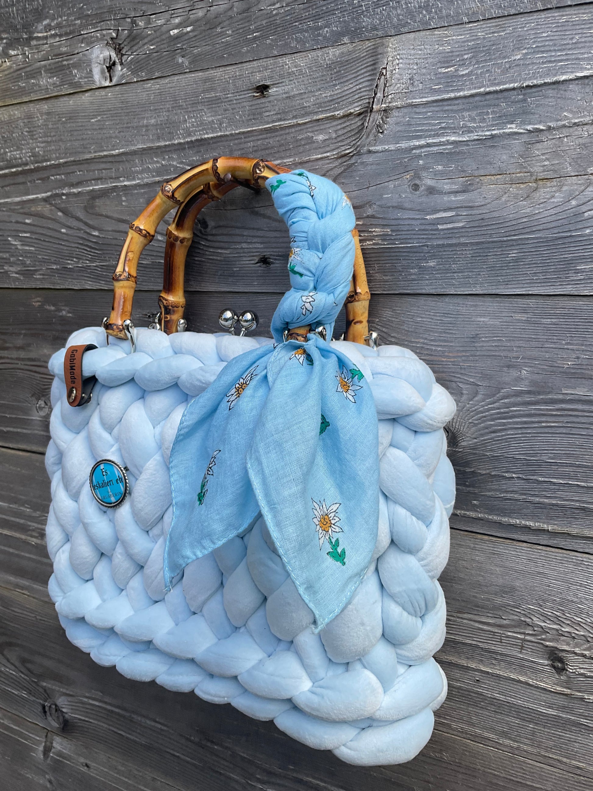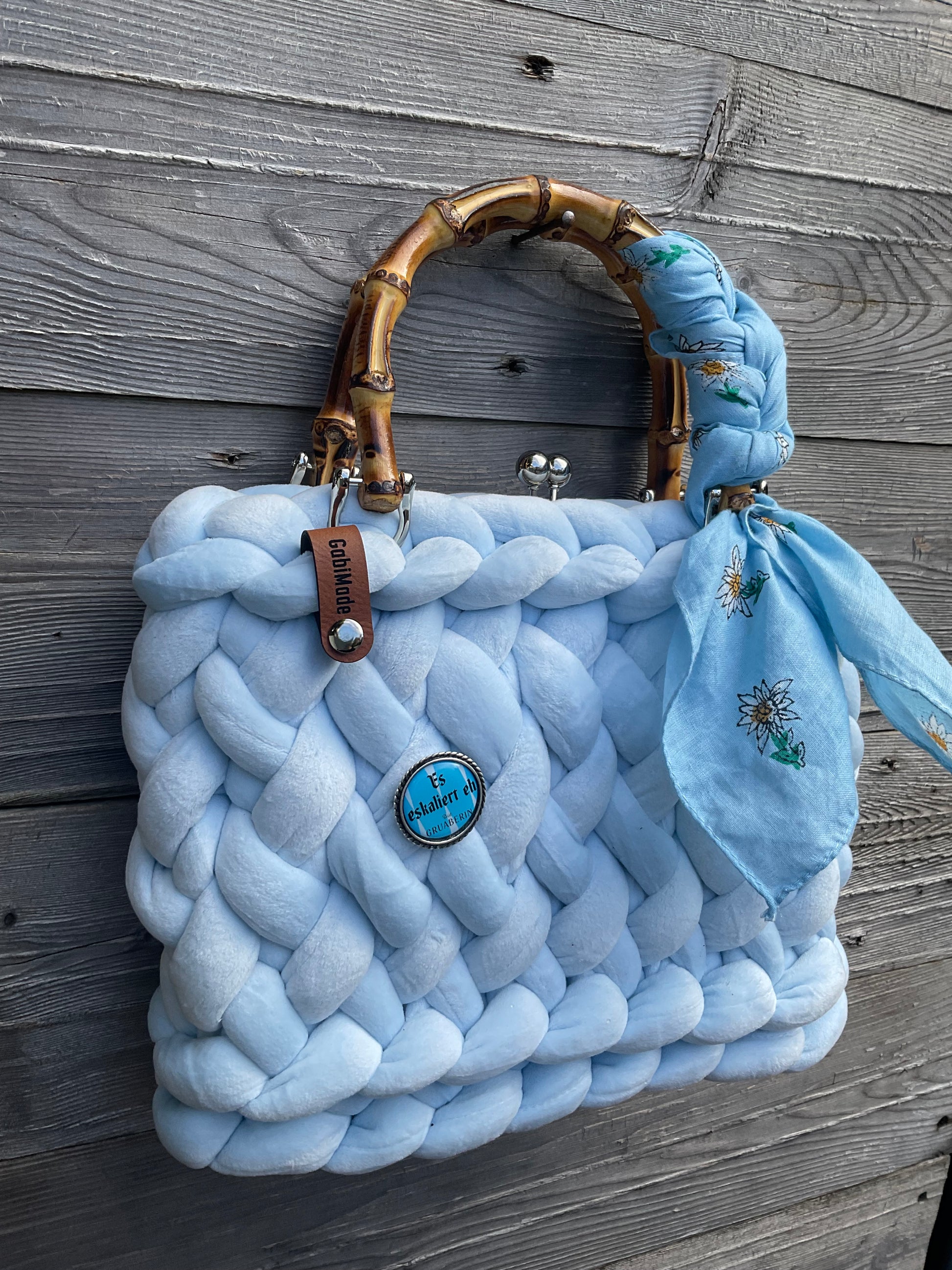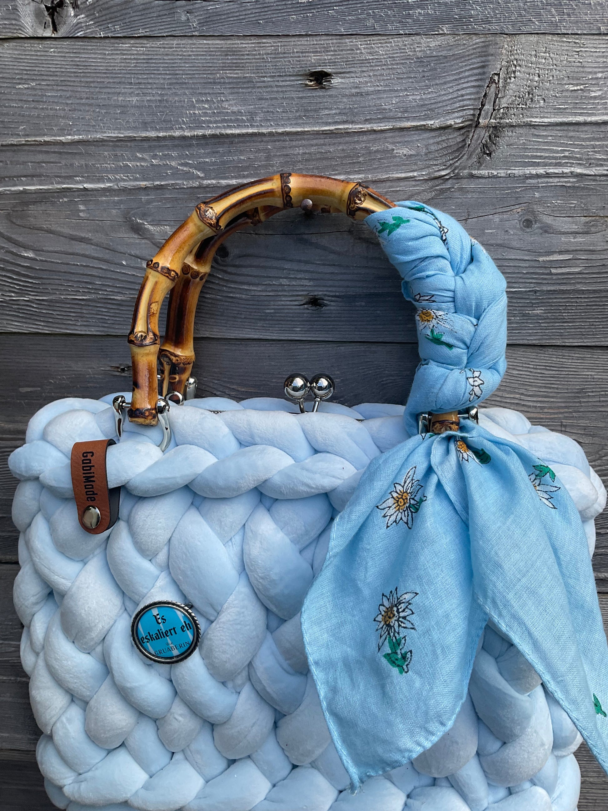 BlueBell aus Samt 🩵 ist ausgestattet mit Bambusgriffen, einem Kussmundverschluss damit die Tasche komplett verschlossen ist, einem SchnupferTuch und einem originalen Gaudiknopf Anstecker , einer Schulterkette ( beides abnehmbar) und einem passenden Organizer mit Reißverschluss 🩵 Jede Tasche ist ein Unikat