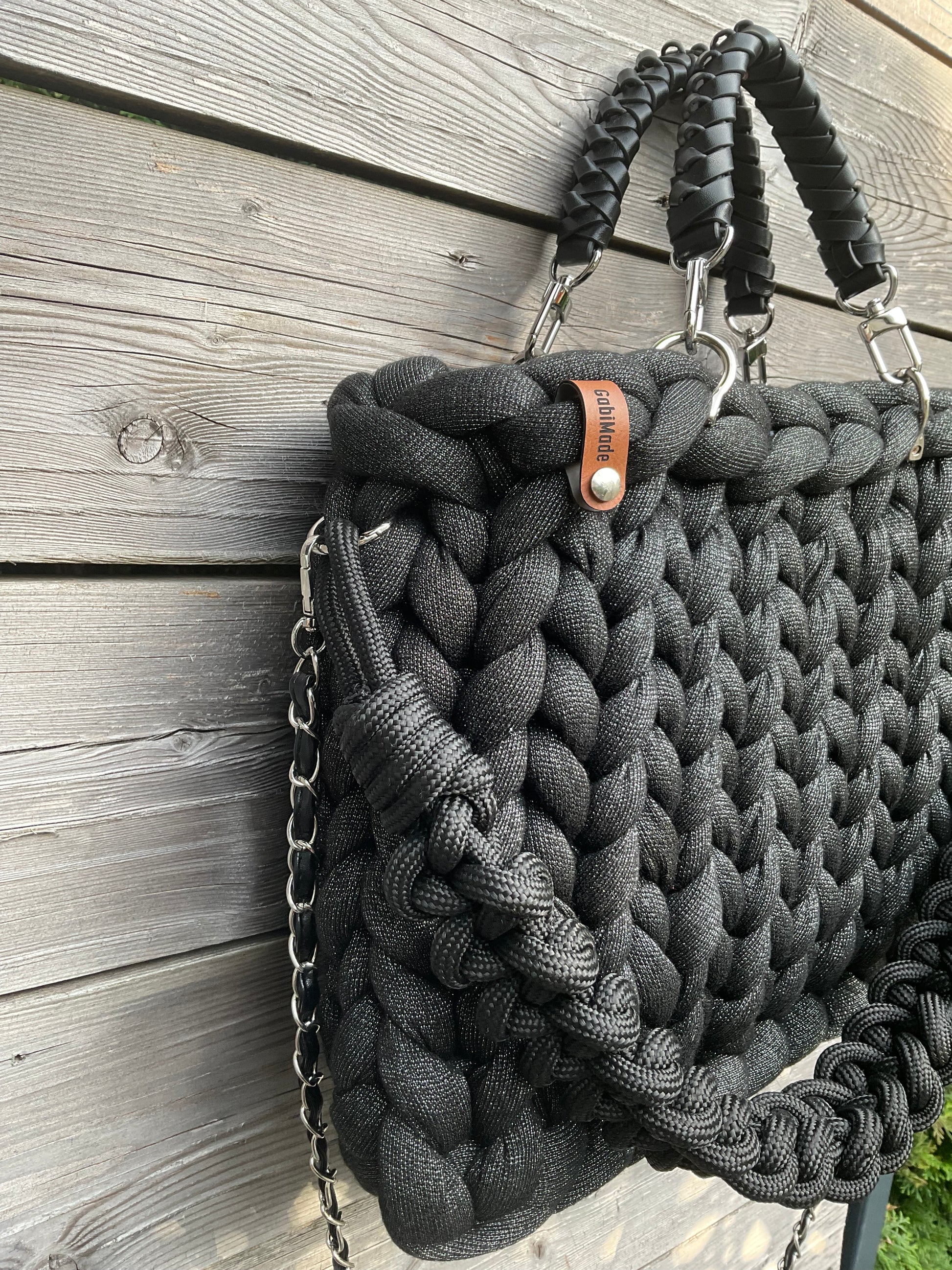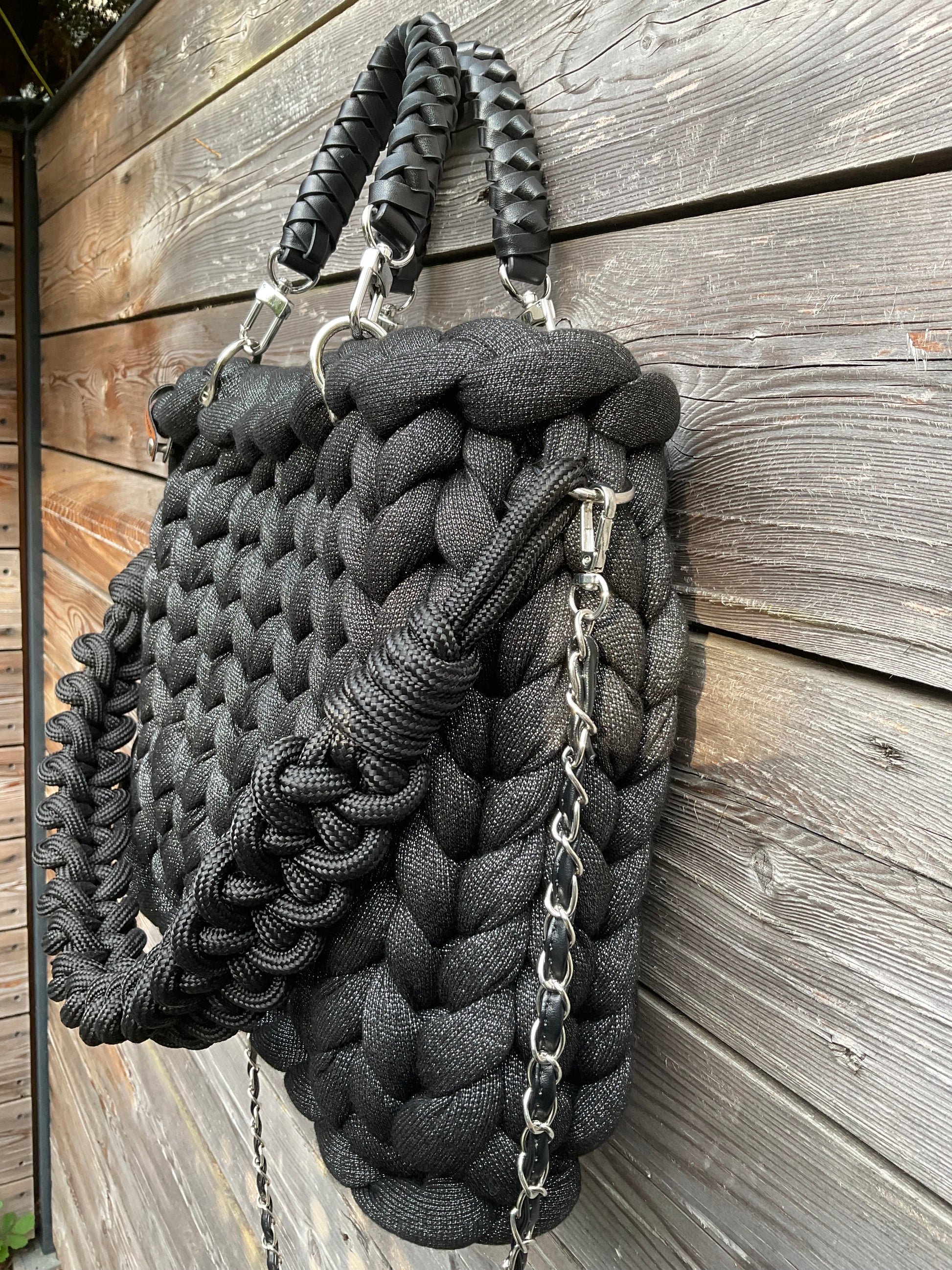 Chantal🖤ist eine ganz schöne und wirst damit zum absoluten Hingucker…Chantal in Schwarz mit silbernen Lurexfäden durchzogen ist mit geflochtenen Ledergriffen, einen edlen Schultergurt den man auch als Zierkette nutzen kann mit einem zusätzlichen Paracord Gurt … beide abnehmbar , GabiMade Logo, einem Organizer mit Reißverschlussfach, und einem Karabiner zum verschließen der Tasche ausgestattet.