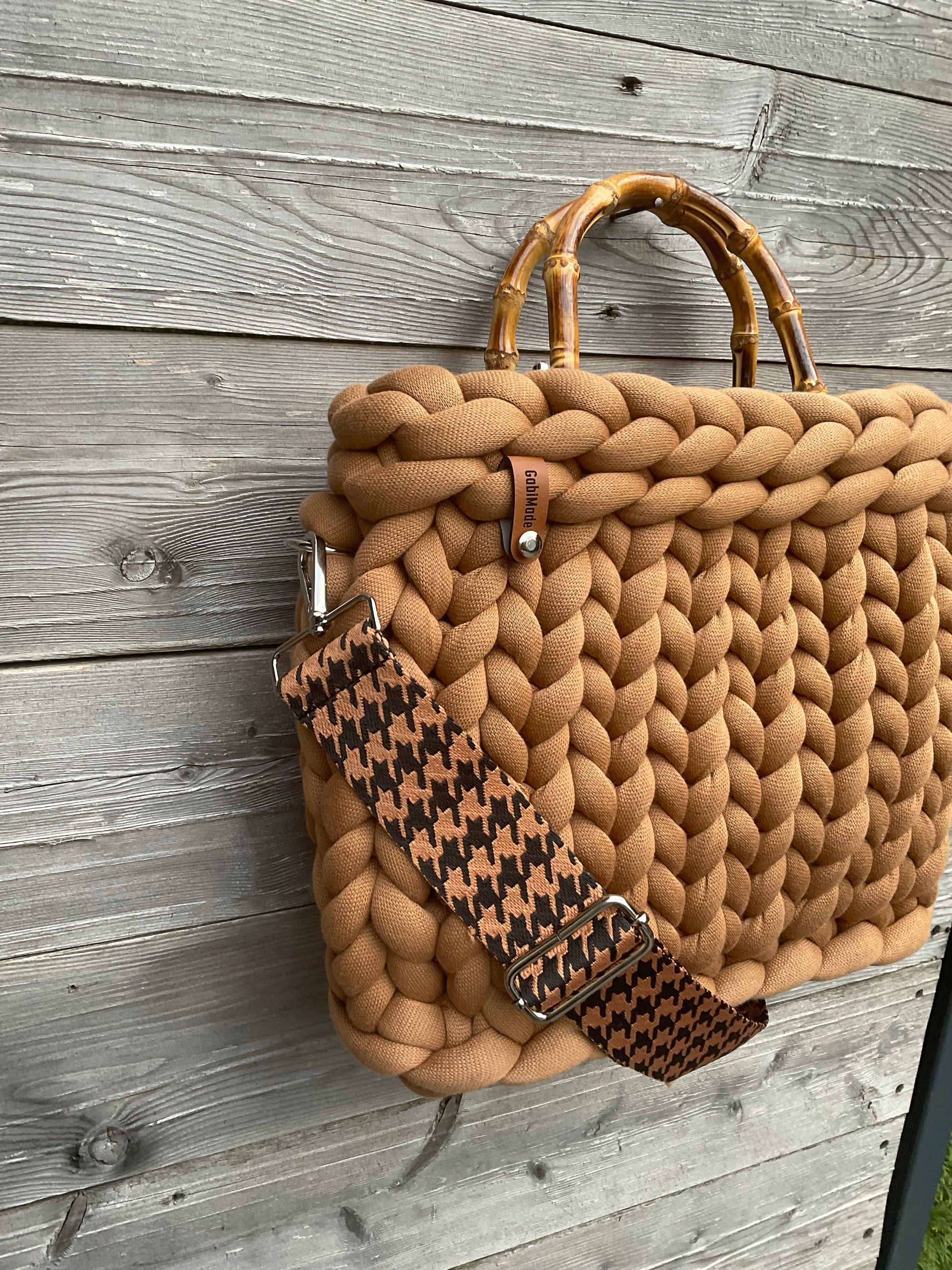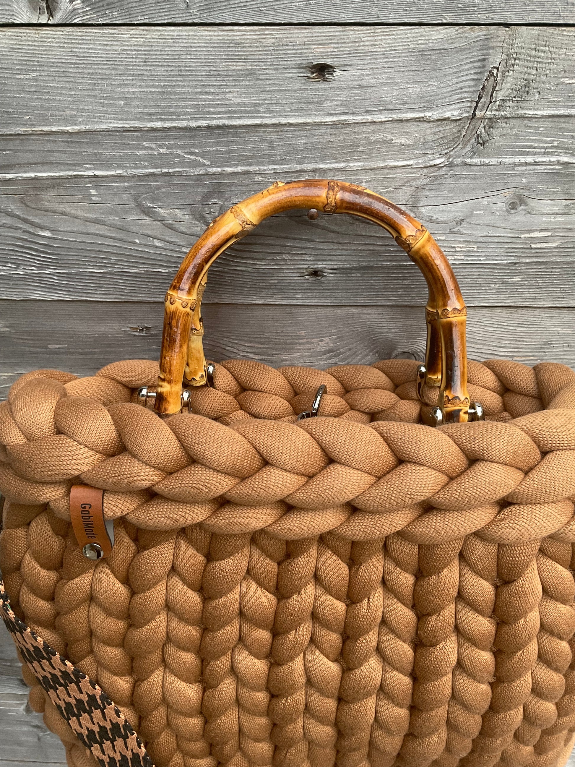 Chicca in der wunderschönen Farbe Cognac ist mit Bambusgriffen, einen verstellbaren Schultergurt GabiMade Logo, einem passenden Organizer und einem Karabiner zum verschließen der Tasche ausgestattet.