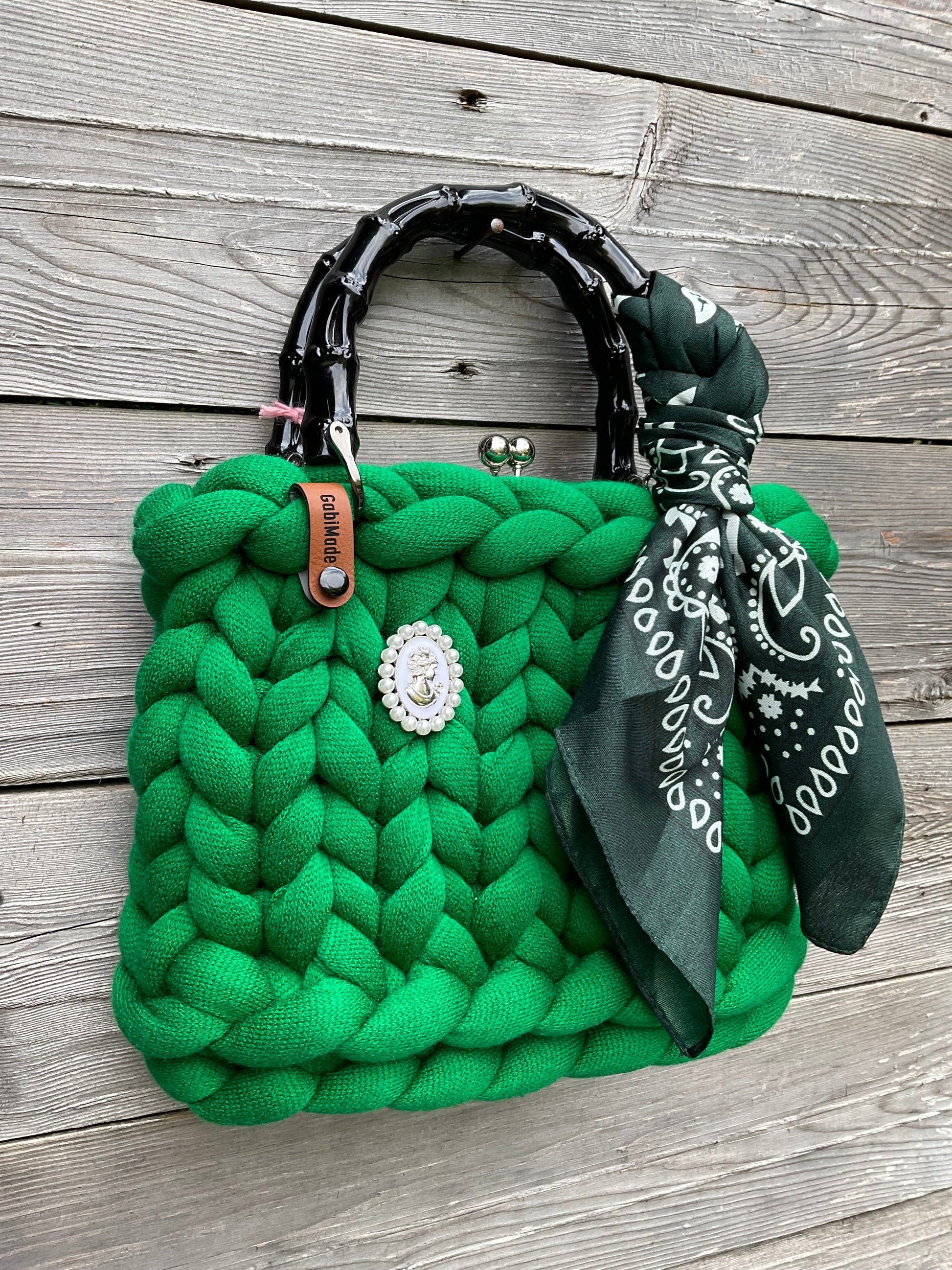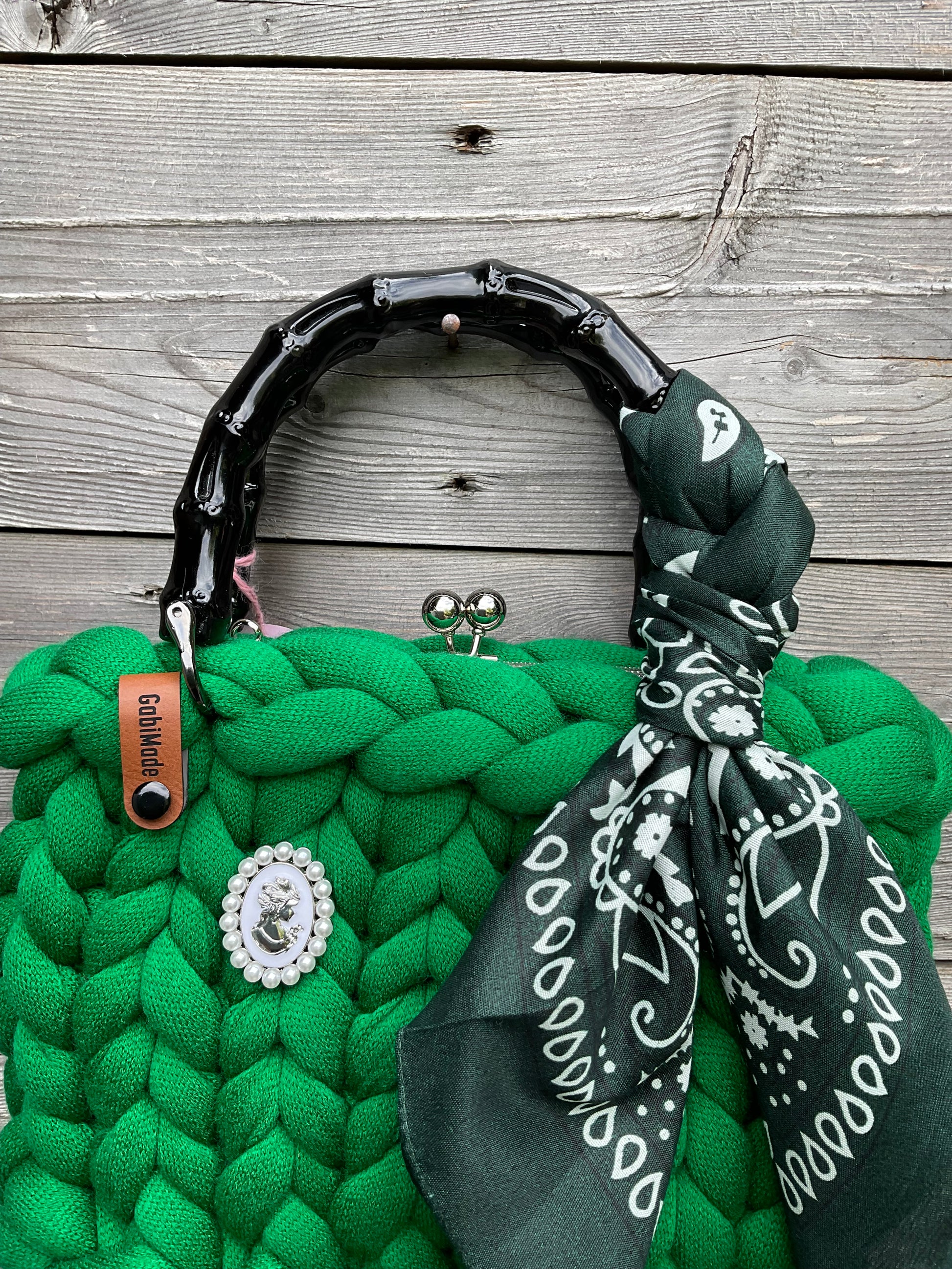 Hilda 💚 ist mit schwarzen Kunststoff Bambusgriffen, Kussmundverschluss, einem wunderschönen Gemmenknopf ,  GabiMade Logo, einem dunkelgrünen SchnupferTuch das man natürlich abnehmen kann , einer zusätzlich Crossbody Kette und passenden Organizer ausgestattet.