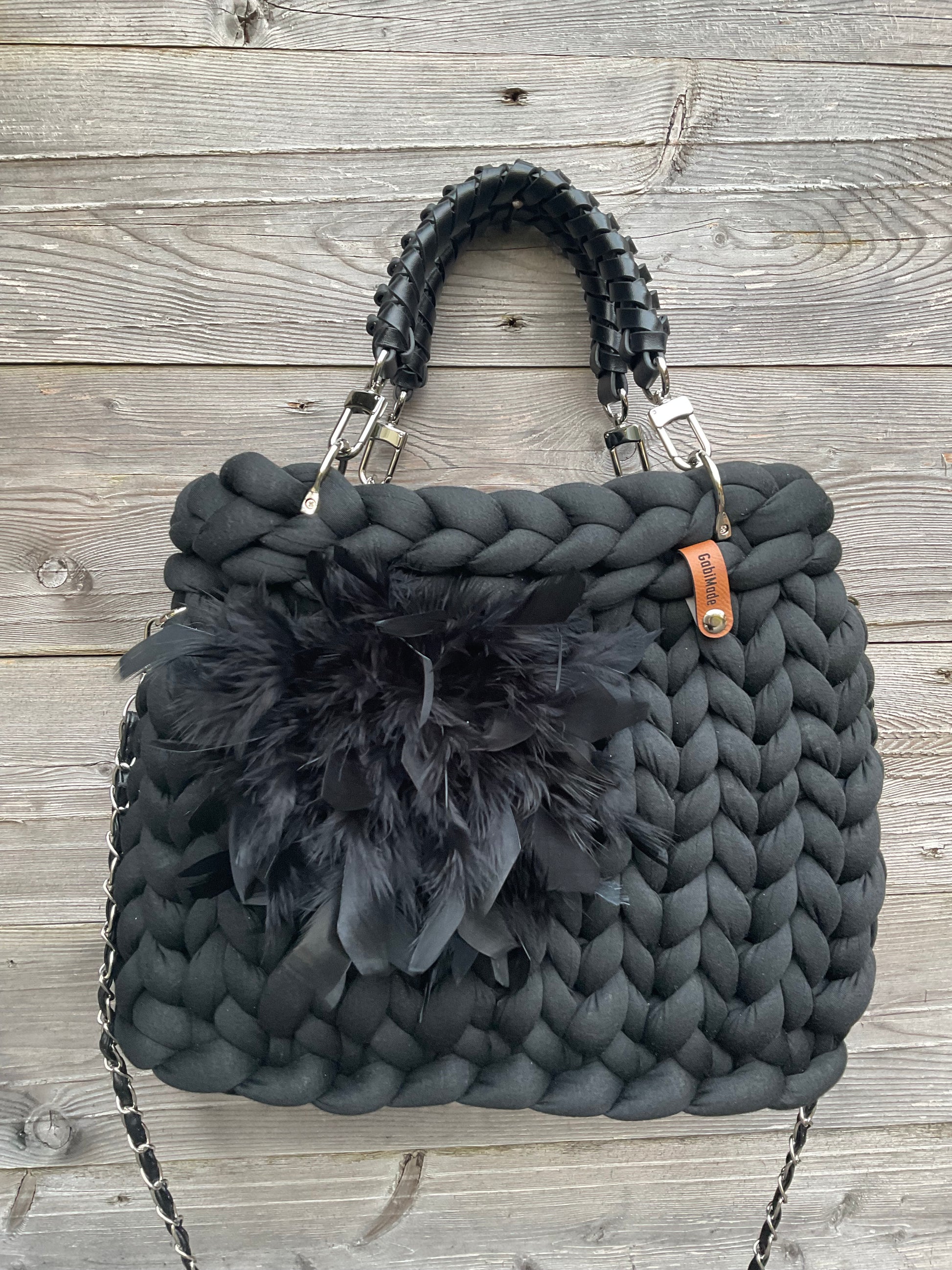 Wunderschöne edle Tasche in Schwarz mit geflochtenen Ledregriffen, abnehmbaren Federbrosche, Gabimade Logo, einer besonderen CrossbodyKette …auch abnehmbar, passenden Organizer und einem Karabiner zum verschließen der Tasche 🖤
