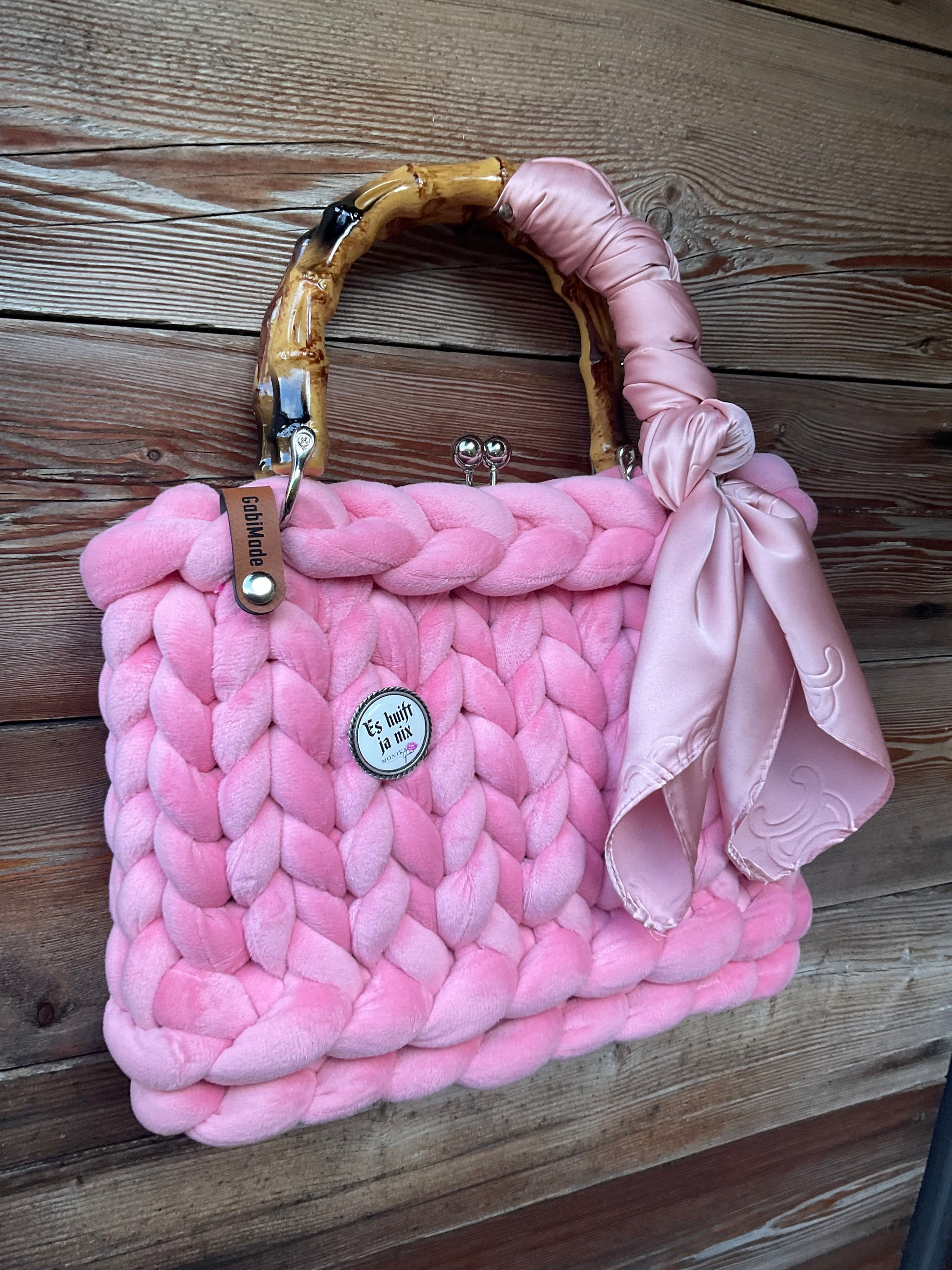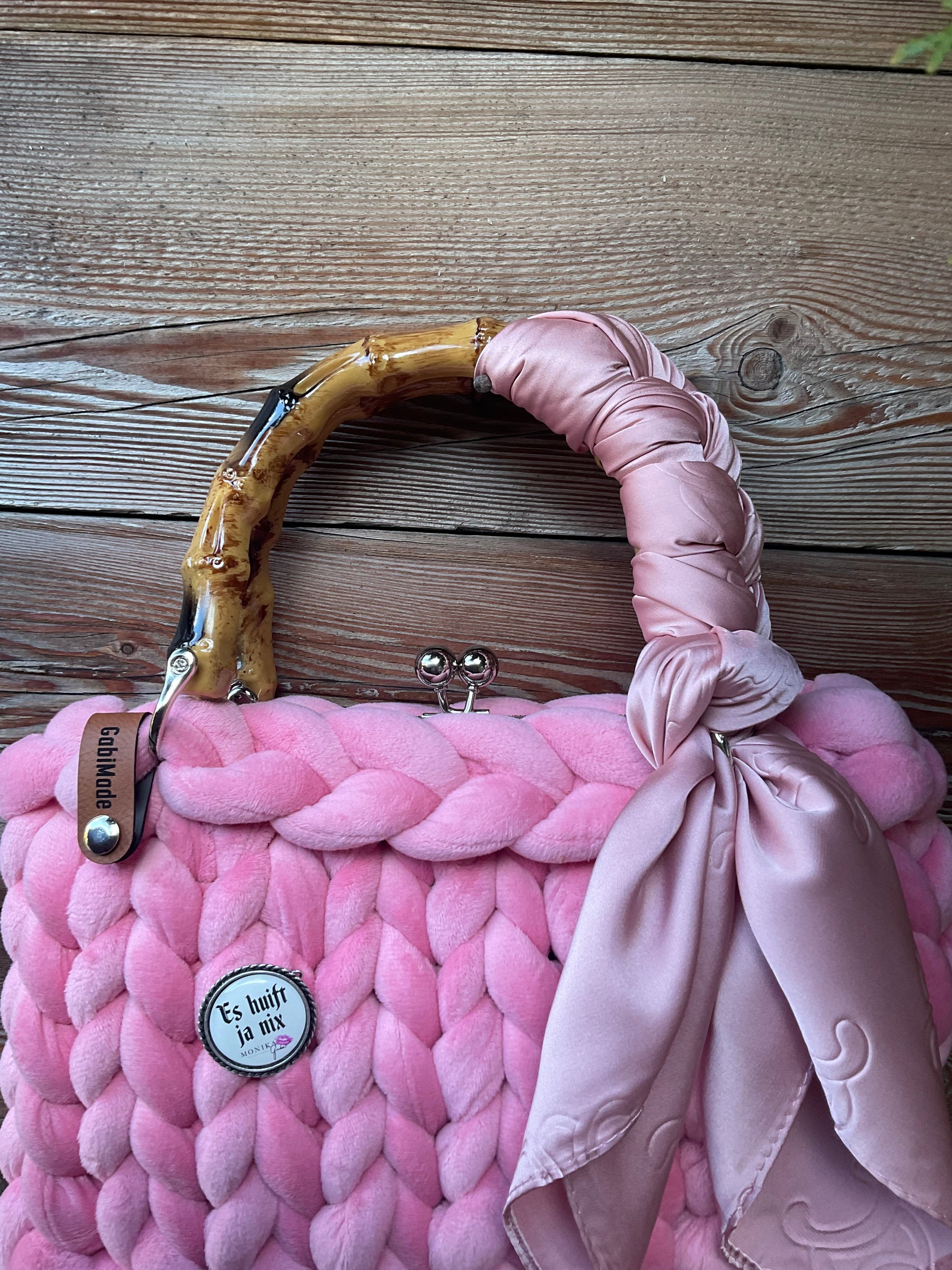 Wunderschöne Trachtentasche aus Samt in einem wunderschönen zarten Rosé mit Kussmundverschluss, einem Original Gaudiknopf Anstecker, Bambusgriffen, einem abnehmbaren Tuch, abnehmbarer Crossbodykette und passender Innentasche.