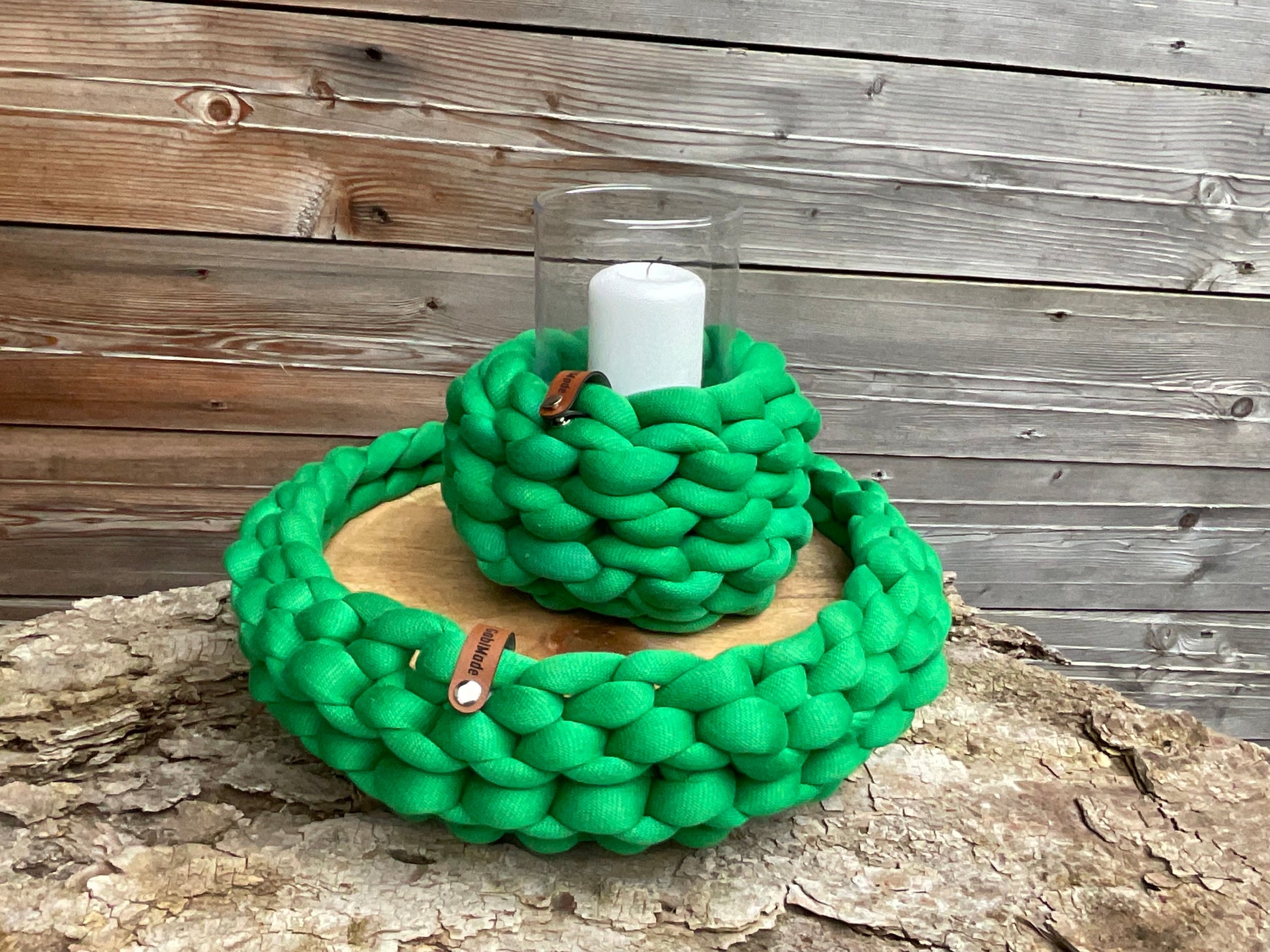 Grobstrick Tablett in einem wunderschönen Grün mit einem 25 cm Bambusteller, Bambusgriffen und dem Gabimade Logo ausgestattet.