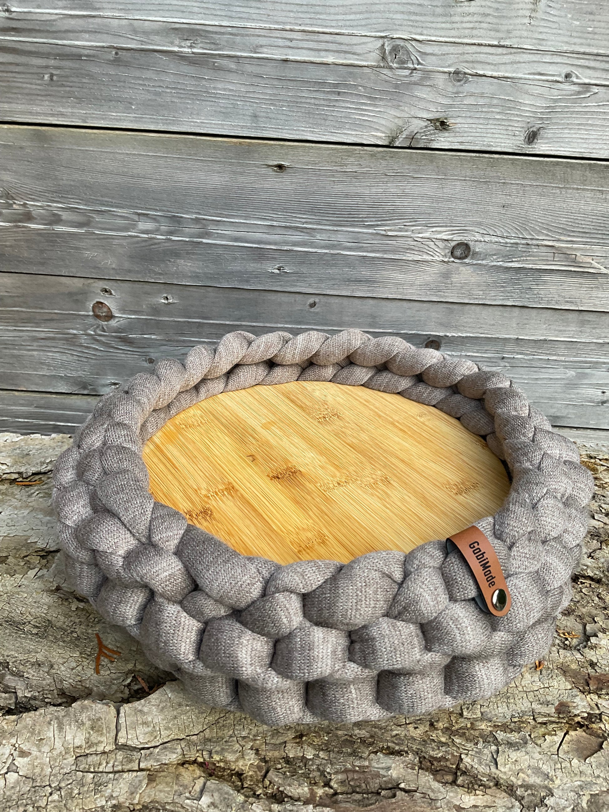 Grobstricktablett mit einer wunderschönen Servierplatte aus Echtholz & GabiMade Logo