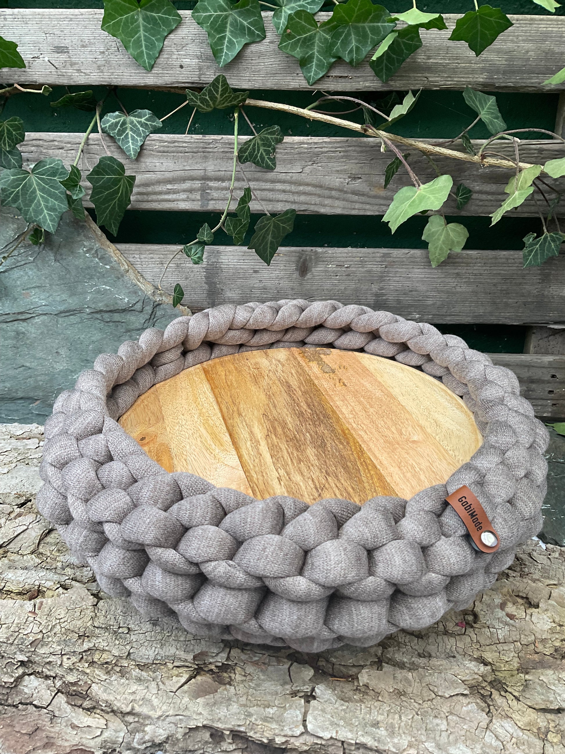 Grobstricktablett mit einer wunderschönen Servierplatte aus Echtholz & GabiMade Logo